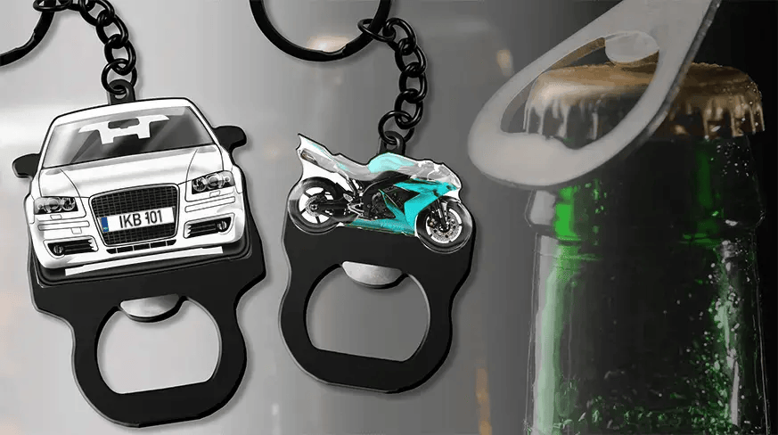 Hol dir jetzt deinen personalisierten Flaschenöffner-Schlüsselanhänger mit deinem Fahrzeug und Kennzeichen!