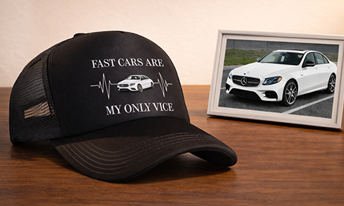 Två svarta kepsar med sportbil och hjärtslagsdesign, FAST CARS ARE MY ONLY VICE-text över och under grafiken